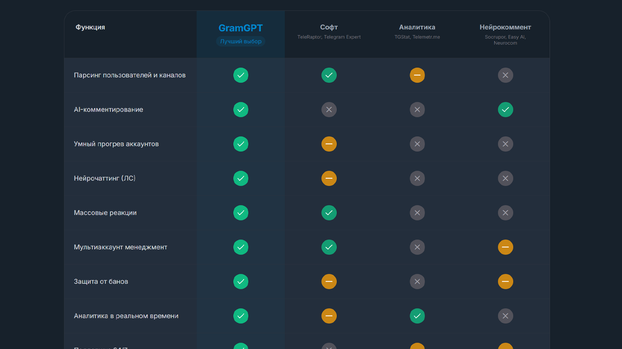 Это делает GramGPT не просто “утилитой”, а полноценной рабочей средой для Telegram‑маркетинга.